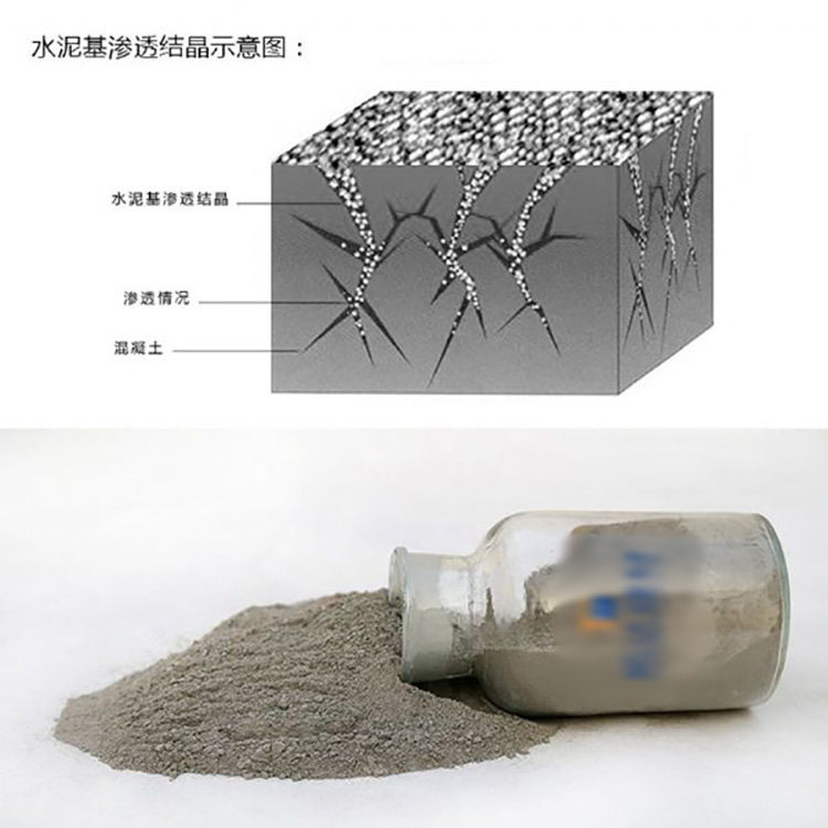 與水作用后,材料中含有的活性化學物質通過載體水向混凝土內部滲透,在混凝土中形成不溶于水的結晶體,堵塞毛細孔道,從而使混凝土致密、防水。